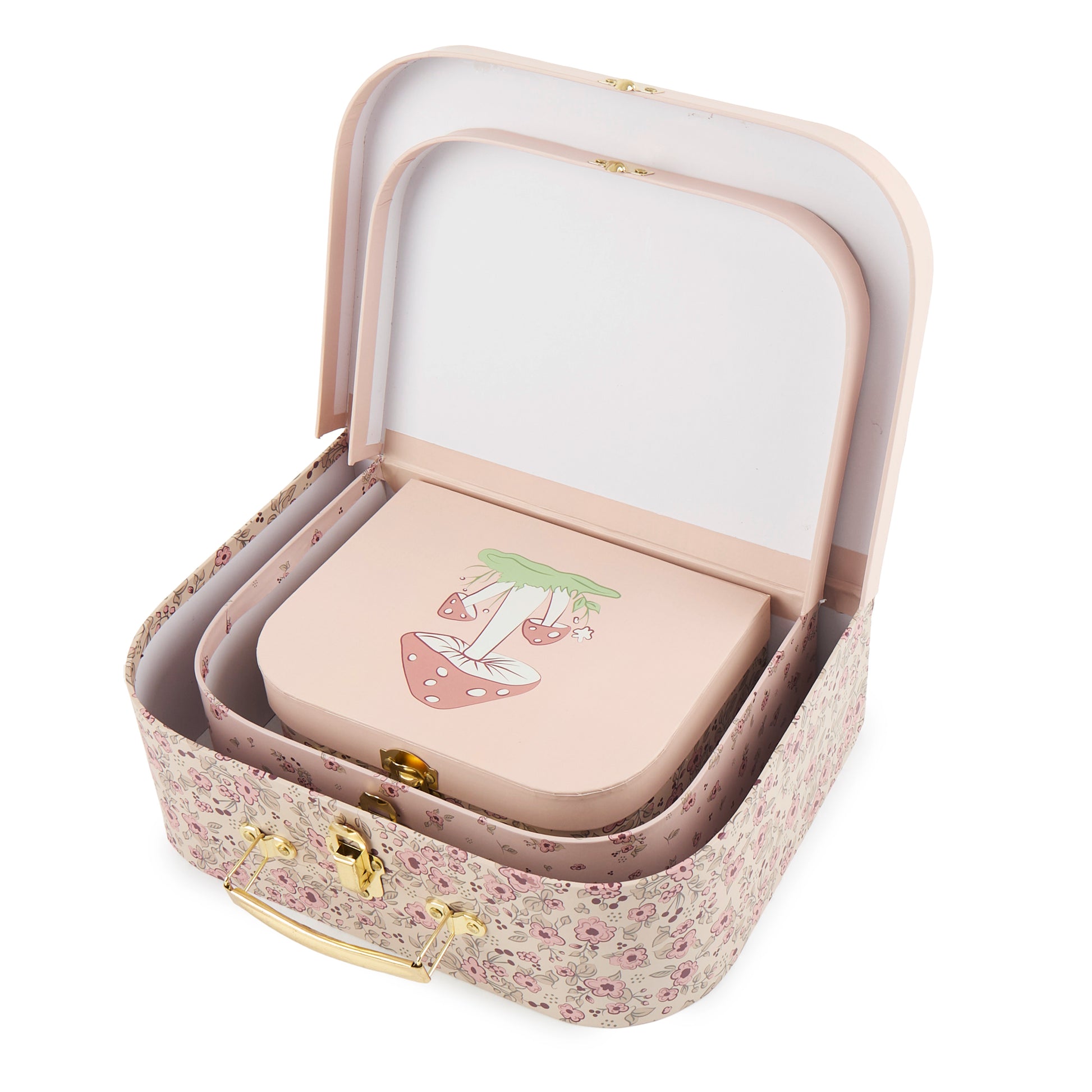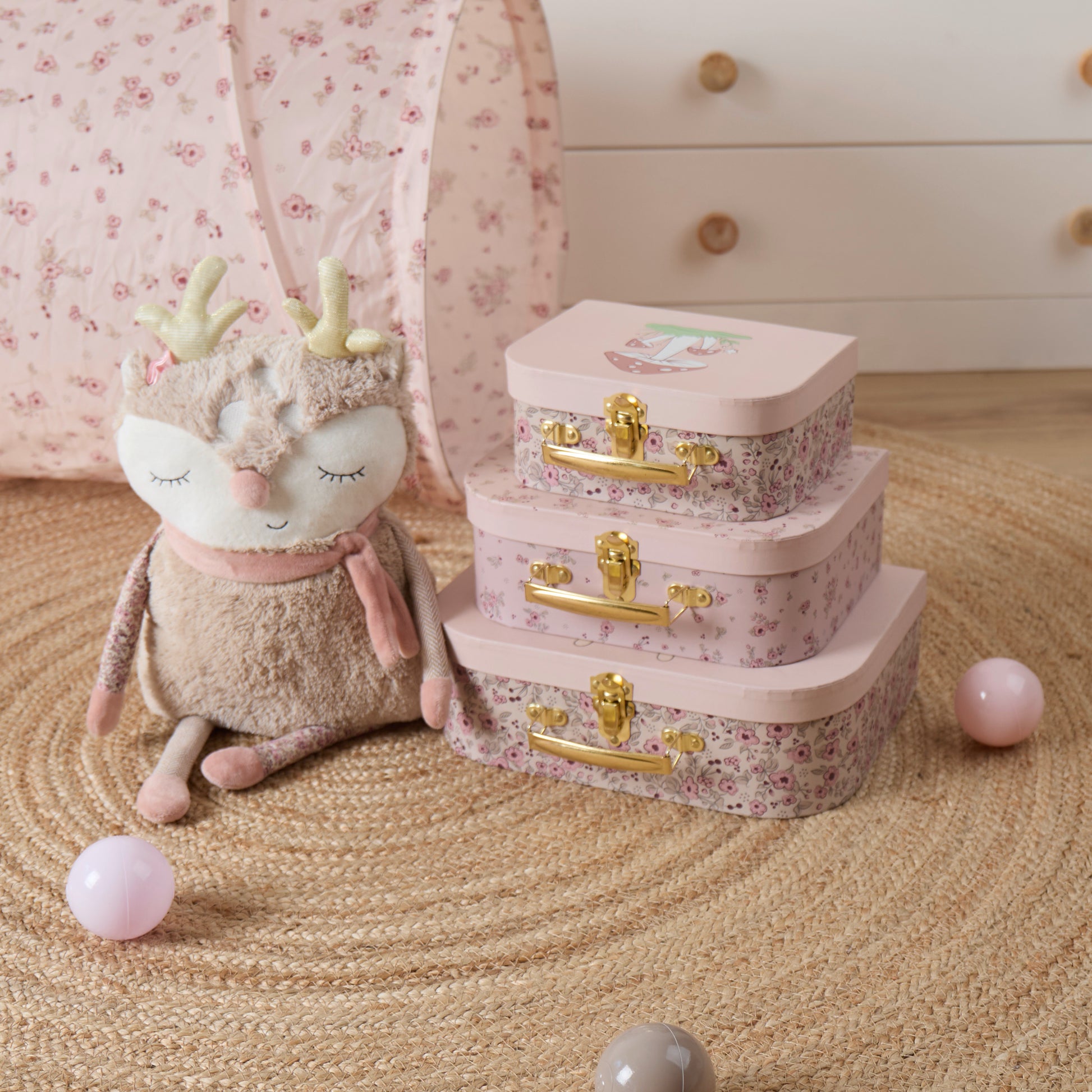 Wunderschöne Illustrationen und traumhafte Blumenprints – diese Koffer sind absolute Hingucker im Kinderzimmer. Das Set besteht aus drei Koffern, passend zu unserer Reh Ella Kollektion. In diesen zauberhaften Koffern kann dein Kind kleine Schätze sammeln und aufbewahren oder überall mit hinnehmen. Auch für das fantasievolle Rollenspiel sind die Koffer ein beliebtes Accessoire. Geht ihr auf Reisen, sind die Kids oft besonders stolz ihr eigenes kleines Gepäckstück mitzunehmen, in dem sie ihre Lieblingssachen bei sich haben.