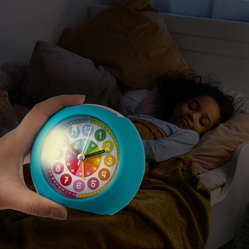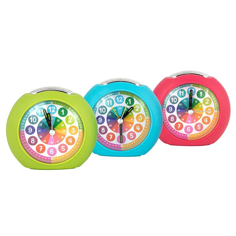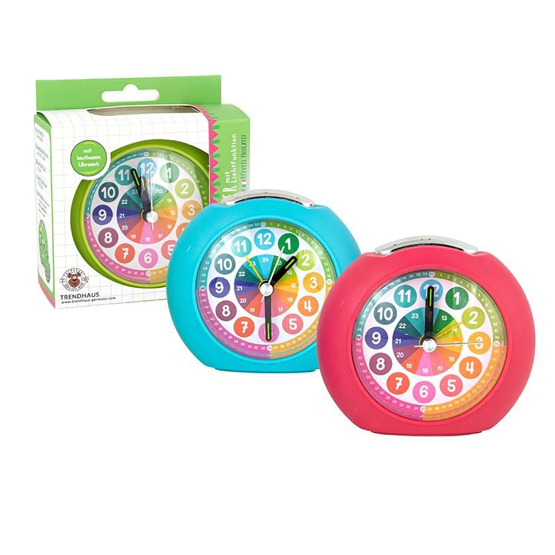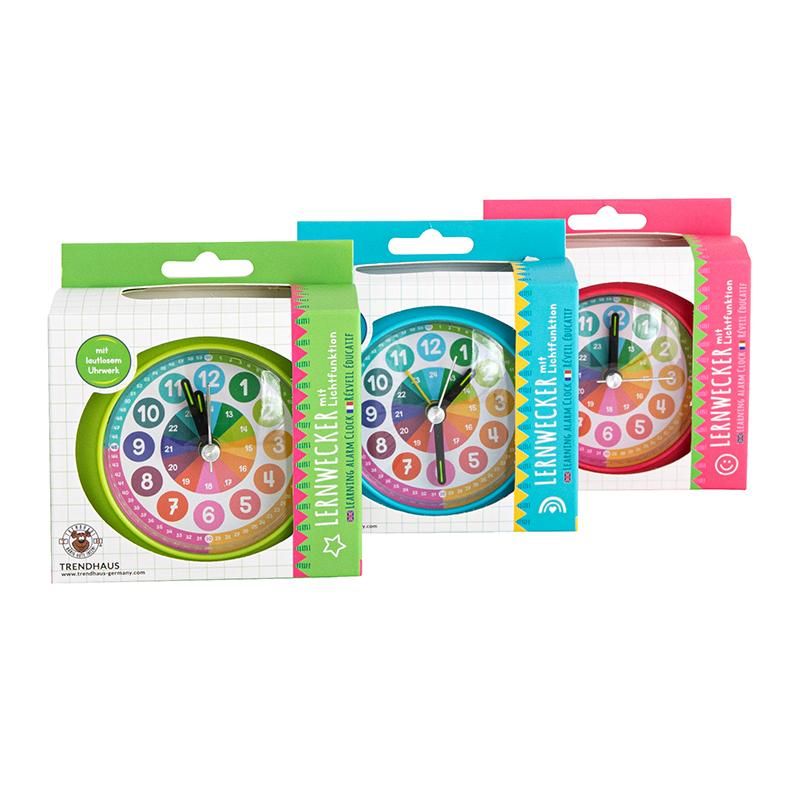 Spielend leicht die Uhrzeit lernen - mit diesem Lernwecker ist das ganz leicht! Durch das speziell gestaltete Ziffernblatt lernen Kinder spielerisch und schnell die Einteilung des Tages in 24 Stunden, Viertelstunden, 60 Minuten und Sekunden und können lernen ganz einfach, den Alarm einzustellen. Zudem überzeugt dieser farbenfrohe Lernwecker durch ein leises Quarzuhrwerk und durch die integrierte Lichtfunktion, die auch ein Ablesen der Uhrzeit im Dunkeln möglich macht.
