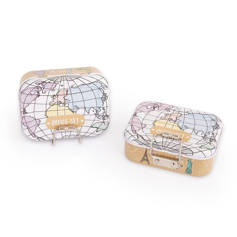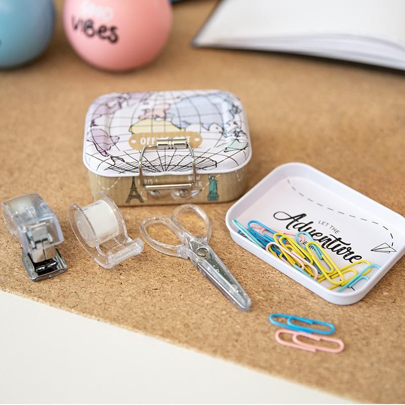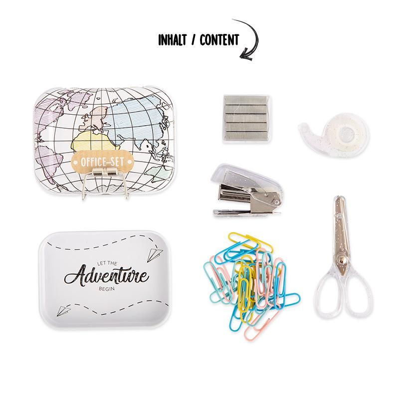 Du liebst es aufgeräumt? Dann ist dieses Mini-Office-Set to go perfekt für dich! Mit dem handlichen Metall-Köfferchen hast du alles dabei und griffbereit. Auf zwei Ebenen sind hier Büroklammern, Schere, Klebebandabroller, Tacker und Heftklammern praktisch verstaut. Das Adventure-Design macht das Set auch optisch zu einem echten Highlight - eine wunderbare Geschenkidee für Klein und Groß!
