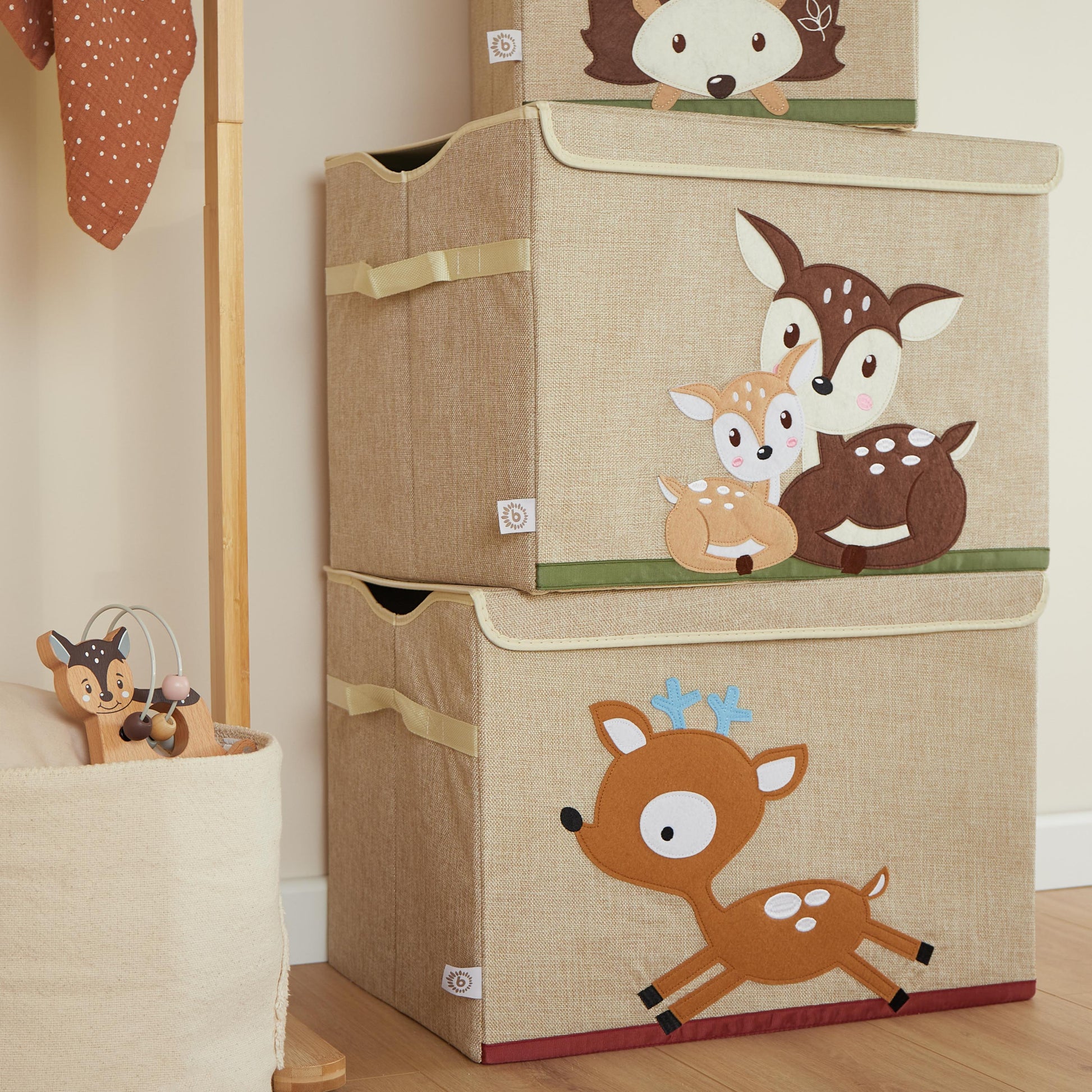 Diese schöne Spielzeugbox von Bieco bringt Ordnung ins Kinderzimmer. Die dekorative Kiste hat einen Deckel zum Aufklappen, der sich mit einem Klettverschluss leicht verschließen lässt. Wird die Aufbewahrungsbox einmal nicht benötigt, kann sie einfach zusammengefaltet werden und verschwindet platzsparend im Schrank. Dank der Tragegriffe an der Seite der Box lässt sie sich spielend einfach transportieren. Mit einem Fassungsvermögen von etwa 65 Litern bietet die schöne Box viel Platz für Lieblingsspielzeug, Kleidung und andere Dinge. Entdecke auch unsere weiteren Aufbewahrungsboxen in groß und klein für das Kinderzimmer mit weiteren niedlichen Motiven.