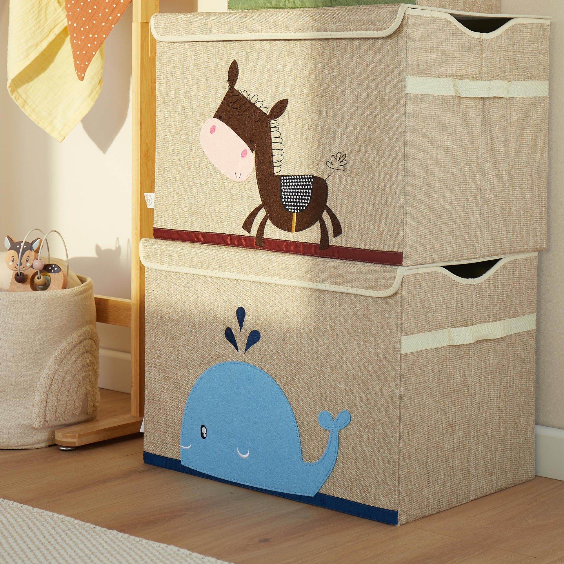 Diese schöne Spielzeugbox von Bieco bringt Ordnung ins Kinderzimmer. Die dekorative Kiste hat einen Deckel zum Aufklappen, der sich mit einem Klettverschluss leicht verschließen lässt. Wird die Aufbewahrungsbox einmal nicht benötigt, kann sie einfach zusammengefaltet werden und verschwindet platzsparend im Schrank. Dank der Tragegriffe an der Seite der Box lässt sie sich spielend einfach transportieren. Mit einem Fassungsvermögen von etwa 65 Litern bietet die schöne Box viel Platz für Lieblingsspielzeug, Kleidung und andere Dinge. Entdecke auch unsere weiteren Aufbewahrungsboxen in groß und klein für das Kinderzimmer mit weiteren niedlichen Motiven.