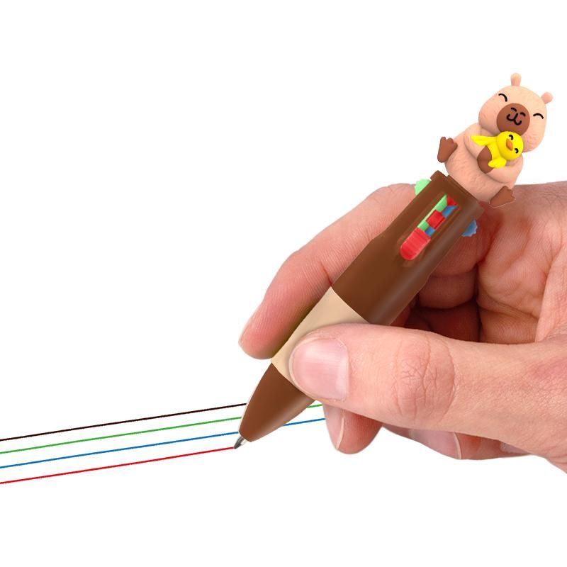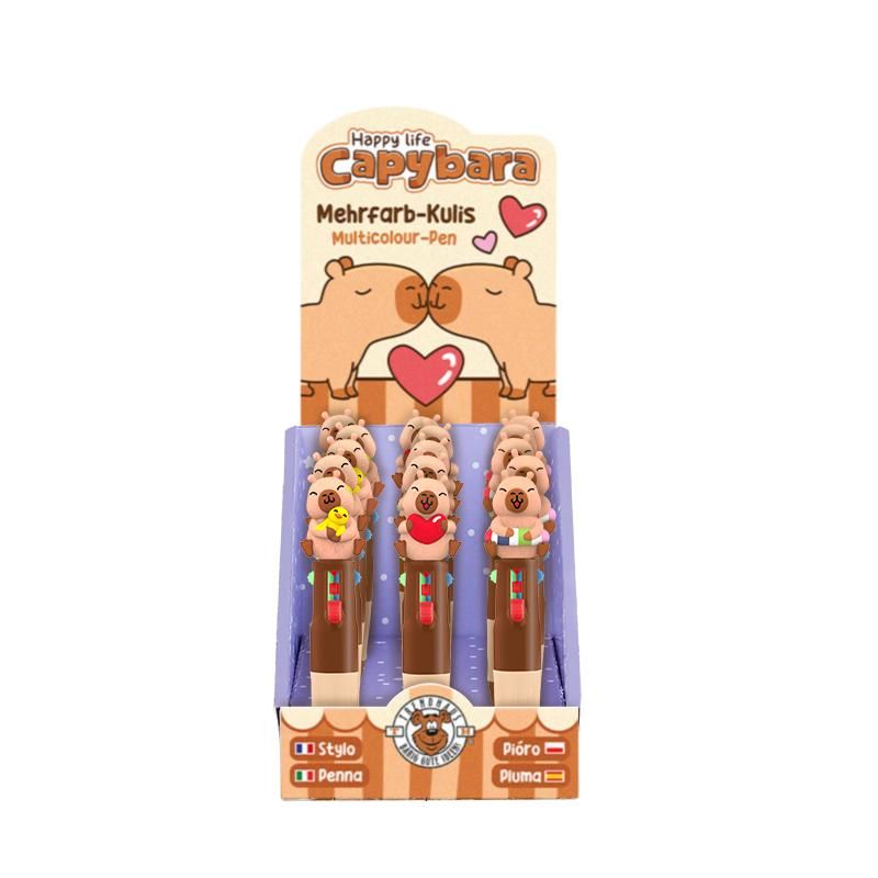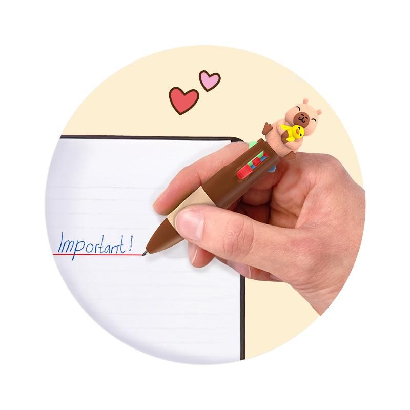 Dieser Mini-Kugelschreiber mit niedlichem Capybara-Topper und 4 verschiedenen Schreibfarben (schwarz, blau, rot, grün) sorgt für besonders viel Schreibspaß. Perfekt zum Scribbeln und Gestalten! Mit Soft-Touch-Griffstück für ein besonders angenehmes Schreibgefühl. Strichstärke: 0,7 mm