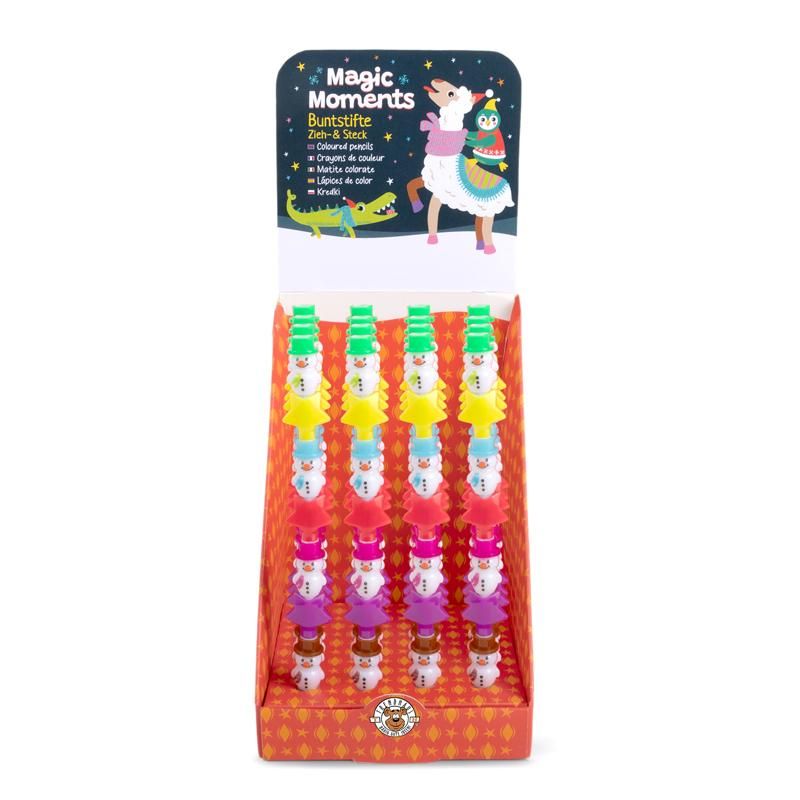 Mit diesem Buntstift in 7 tollen, kräftigen Farben hast Du dank der Zieh- und Steckmöglichkeit Deine Lieblingsfarben immer griffbereit. Die lustige Schneemann- und Stern-Optik pro Steckstift ist ein Blickfang in jedem Federmäppchen und auf jedem Schreibtisch.
