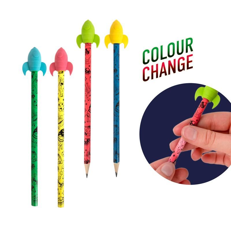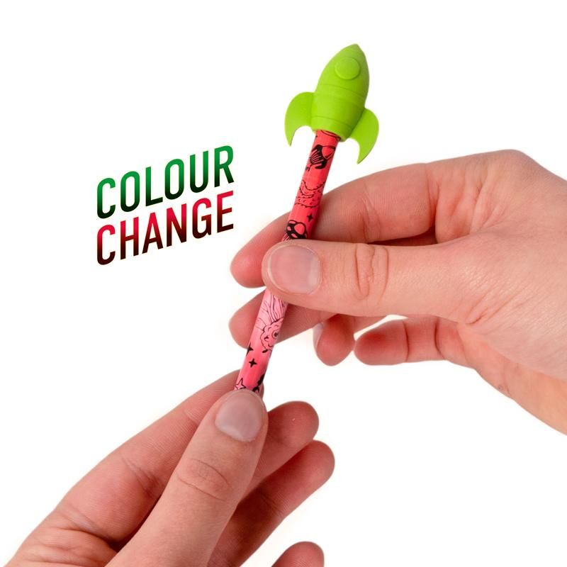 Abwechslung gefällig? Dieser Bleistift mit Raketen-Radiertopper kann mehr als nur Schreiben und Radieren! Einfach an dem Holzbleistift reiben und durch die erzeugte Wärme verändert er seine Farbe – ein absolutes Highlight für jeden Schreibtisch!