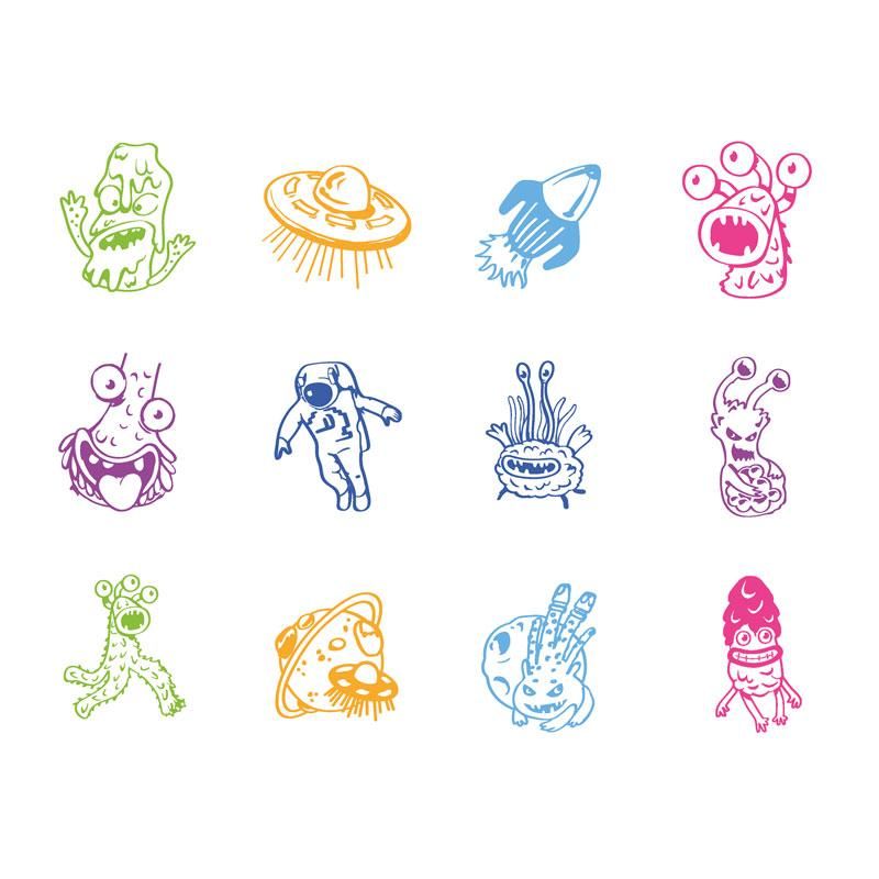 Erhältlich in 12 verschiedenen Motiven rund um das Thema Weltall, Alien(monster) und Raumfahrt.
