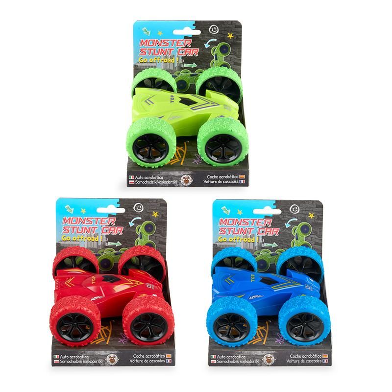 Go offroad! Cooles Monster Stunt-Car mit Action-Garantie! Dieses spektakuläre Stunt-Car fährt selbst nach einem Überschlag auf der anderen Seite weiter! Einfach anschieben – schon beginnt der Fahrspaß für kleine und große Actionfans!