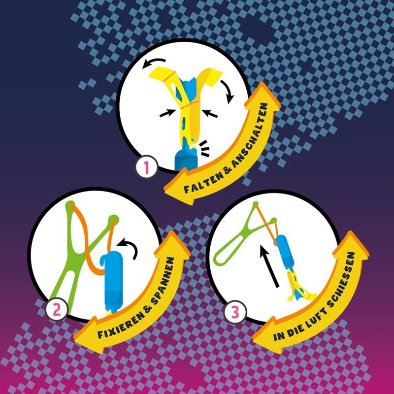 Spannen - abschießen - fliegen lassen! Schieße den Sky-Shooter senkrecht in die Luft und lasse Dich überraschen, wie toll er leuchtend wieder zu Boden fliegt, vor allem im Dunkeln!