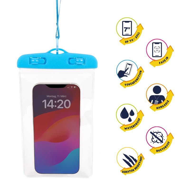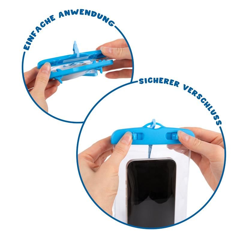 Leicht verschließbare, wasser- & staubdichte Handyhülle, mit der man das Smartphone (bis 7 Zoll) auch unter Wasser bedienen kann. Extras: Abnehmbares Band zum Umhängen, Face-ID und Touch-Funktion gewährleistet und widerstandsfähig gegen Kratzer.