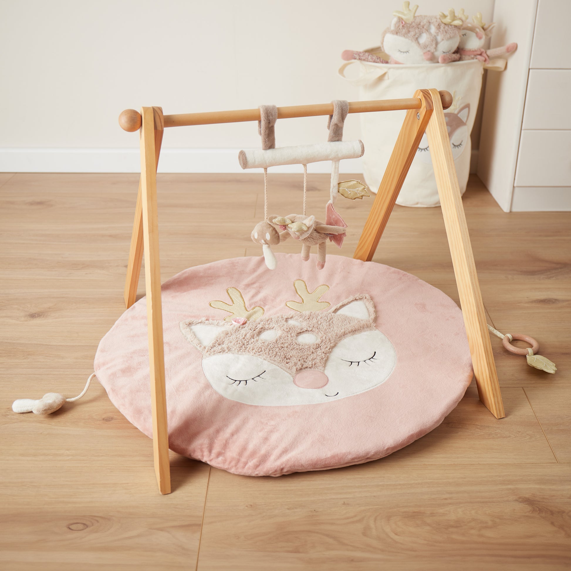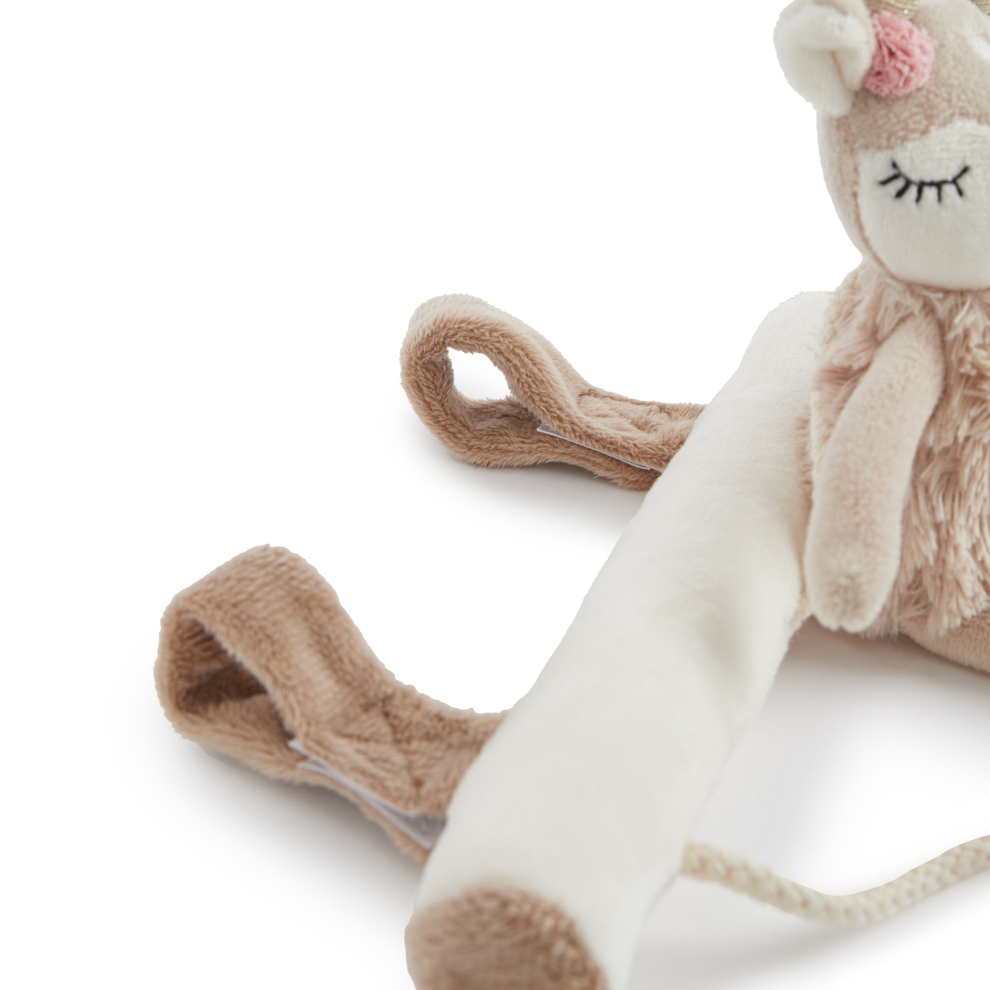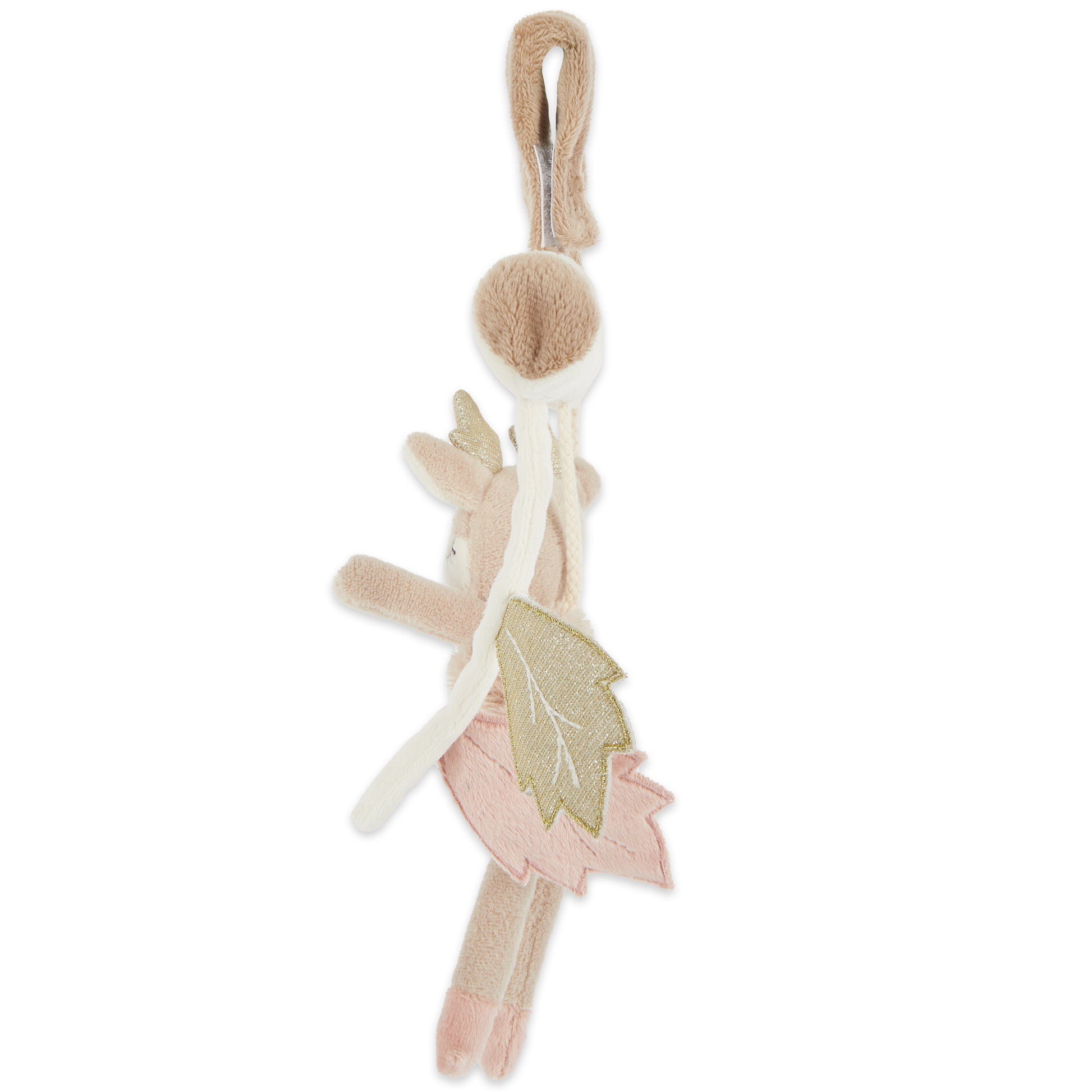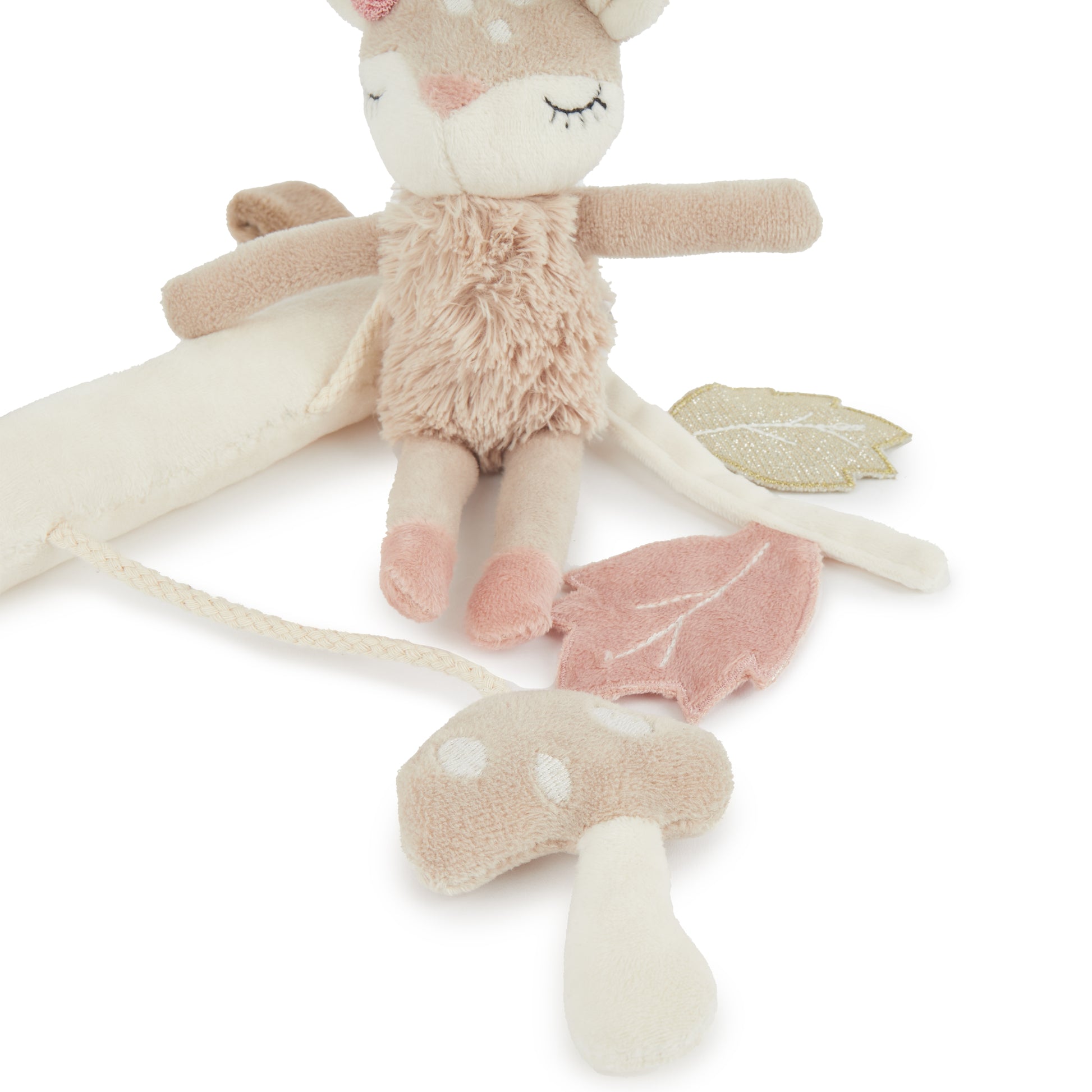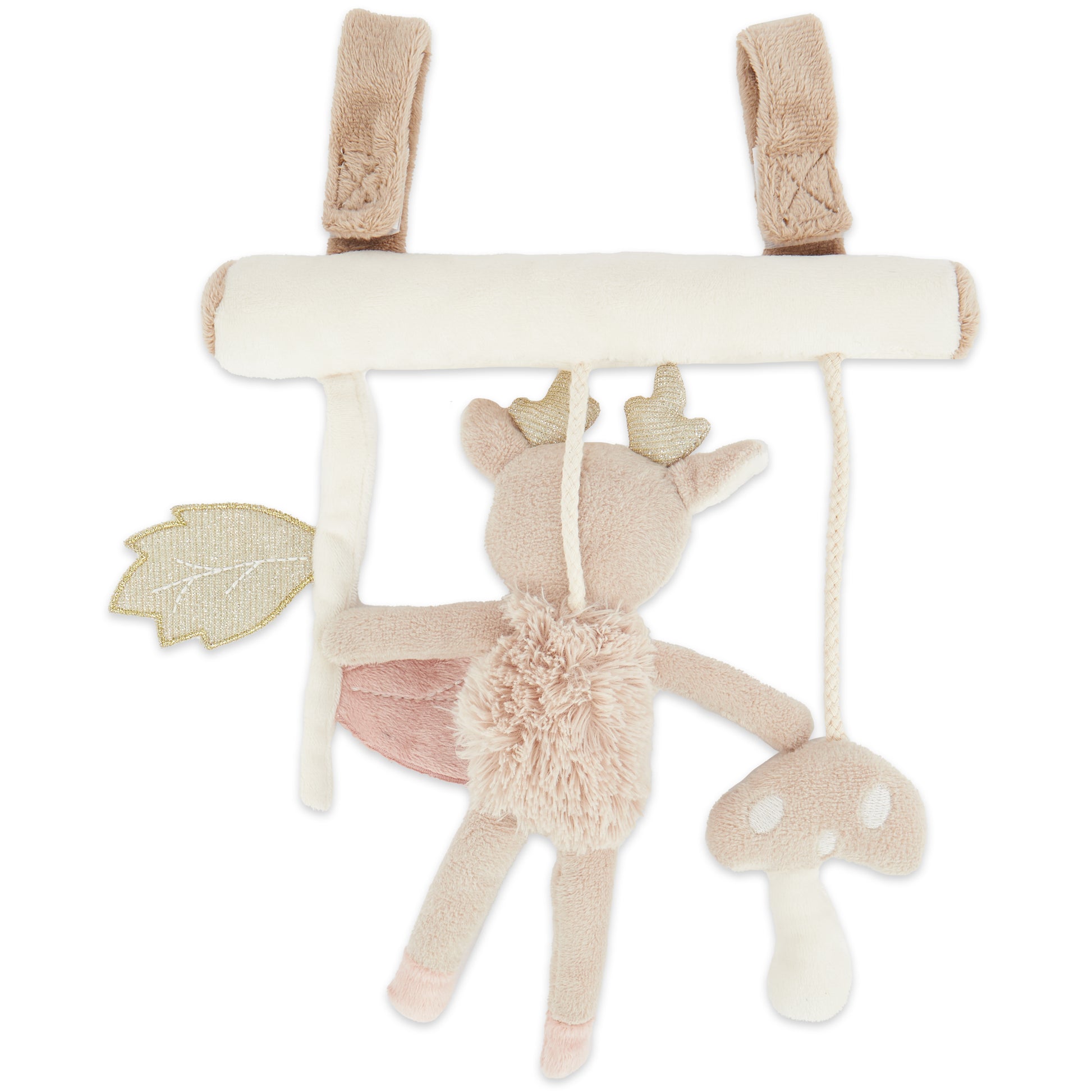 Der niedliche Universalhänger von Bieco eignet sich hervorragend als Kinderwagen Kette, Babyschalen Spielzeug, Buggy Spielzeug oder auch für Laufgitter und als Spielelement für ein Spiel Trapez. Er hat praktische Klettverschlüsse zum Befestigen und kann damit leicht und schnell überall angebracht werden. So kann das süße Reh Spielzeug Dein Baby überall mit hinbegleiten. Die hochwertig verarbeiteten Materialien machen es kuschelweich. Es ist mit unterschiedlichen Formen und Funktionen designed welche die Motorik und Sinneswahrnehmung Deines Babys trainieren. Die Blätter knistern beim Greifen, das Reh rasselt sanft und der Pilz quietscht fröhlich beim Drücken.